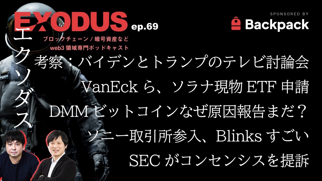 【EXODUS ep.69 トーク内容】仮想通貨(暗号資産)マーケット情報/VanEckと21シェアーズ、米国初の「ソラナ現物ETF」SECに申請/SEC、イーサリアムETFの上場承認書類が7月8日にまでの再提出を申請企業に求める/テレビ討論会を経て72%のアメリカ人、バイデン大統領が大統領として任期を全うできる体力と精神力がない、どうなる米大統領戦/ソラナ、新機能「Blinks」と「Actions」を発表。WebサイトやSNSで暗号資産取引が可能に/SECがコンセンシスを提訴、MetaMaskのスワップとステーキングの証券法違反で/取引所ホエールフィンを運営のアンバージャパンが、昨年ソニーグループに買収されていたことを発表、ソニー暗号資産取引所サービスに本格参入/「俺だけレベルアップな件」、アバランチ採用のゲームリリースへ/DMMビットコイン、流出から1ヶ月経過、未だ流出原因の報告なし
