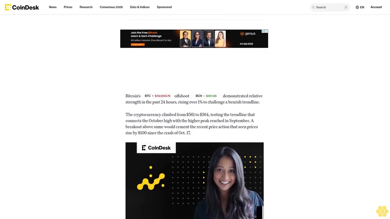 Bitcoin’s BTC$112,759.20 offshoot BCH$562.42 demonstrated relative strength in the past 24 hours, rising over 1% to challenge a bearish trendline.